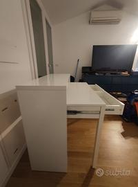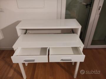 Scrivania come da foto. Adatta per camere piccole, si adatta ad ogni esigenza. Tenuta molto bene, anche se sono presenti piccoli segni di usura. Misure da chiusa: L 99-P37-H88 Da aperta L 99-P68-H88