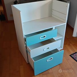 Vendo fasciatoio Smästad che si trasforma in scrivania colore bianco, con 2cassetti classici e uno grande, due azzurri r uno bianco. Usato e con segni di usura visibili anche in foto, in particolar modo la scrivania estraibile che per l'umidità si è gonfiata e fa difficoltà ad entrare nei binari, per questo un prezzo ribassato. parzialmente smontato per questioni di spazio. Ritiro a mano in zona Piramide/Gasometro