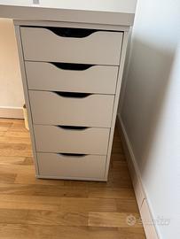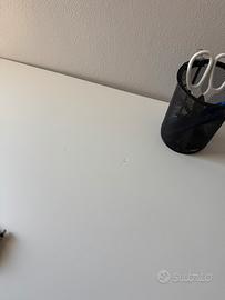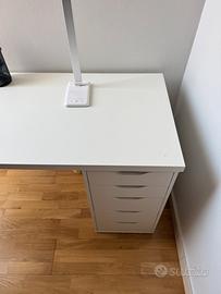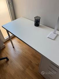 Scrivania bianca IKEA con casettiera incorporata. In ottimo stato tranne due piccoli graffi (vedi foto 5). Dimensioni: larghezza 140cm, profondita’ 60cm, altezza 74cm. Cassettiera larga 36cm con cassetti larghi 32.5cm