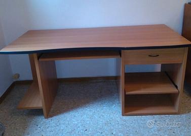 Tavolo da lavoro con ampia superficie e carrello scorrevole sotto il piano utilizzabile come porta tastiera o vano porta documenti. A destra ha un cassetto capiente e un ripiano scorrevole porta stampante/libreria. A sinistra l'alloggio sollevato da terra per computer.