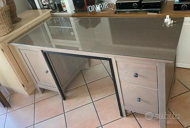 Vendo scrivania hemnes ikea colore grigio tortora molto comoda e capiente, tengo a precisare che sul piano ho fatto aggiungere un vetro su misura costato la meta del valore della scrivania. La scrivania è il legno massello, facile da trasportare perche si puo dividere in 3 pezzi, (piano di appoggio e colonne laterali). Prezzo di vendita 100 euro compreso di vetro do appoggio superiore riportato in foto. Solo consegna a mano, Trasporto a carico dell’acquirente.