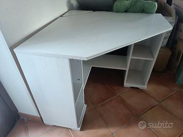 Scrivania Ikea angolare in legno colore bianco. Dimensioni 95x95 cm. Qualche segno di usura. Già smontata. Ritiro immediato a Monterotondo.
