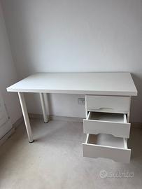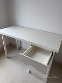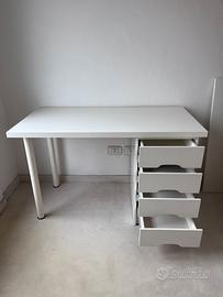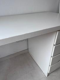 Scrivania bianca con cassettiera componibile IKEA. Misure 120x60 cm 4 cassetti Macchiata in basso sul lato della cassettiera. Ritiro in loco a Bologna
