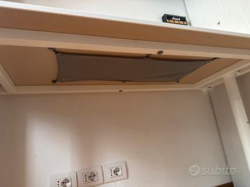 Scrivania ikea, con adesivo attaccato e dotata di porta cuffie e rete sotto per organizzare i cavi