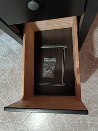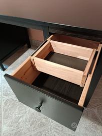 I cassetti possono essere montati sia a destra che a sinistra. Il cassetto superiore ha uno scomparto più piccolo, quello inferiore ha una struttura per schedario regolabile. La scrivania è dotata di fessure per il passaggio dei cavi.