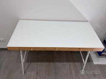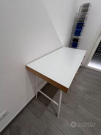 Scrivania nuovissima in bambù con struttura bianca in acciaio, mai utiluzzata se non per metterci su dei peluches. Misura 102x49 cm. Fatto realizzare su misura, a scopo protettivo per il piano, un vetro bianco. Il vetro è solo appoggiato. Vendo il tutto per inutilizzo.