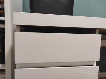 Vendo scrivania Ikea Malm bianca ,misure come da foto. Con segni di utilizzo e un pezzo piccolo mancante sopra al cassetto scorrevole come da foto.