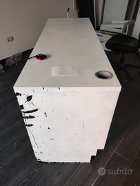 Zampe modificate per adattarsi a delle canaline altezza battiscopa, cassetti bianchi originali, il piano ed il lato pieno sono stati verniciati di bianco con bomboletta. Il ripiano è sempre stato coperto da un telo in gomma, il lato invece si è sverniciato in parte.