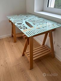 Scrivania Ikea con piano in vetro decorato e cavalletti in legno color rovere. Lunghezza 150 cm. / profondità 75 cm. / altezza da 77 a 80 variabile inclinando i cavalletti. Come nuova!