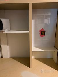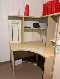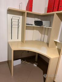 Scrivania ad angolo Ikea, postazione attrezzata con scrivania angolare 120x120, porta riviste, ripoano stampante (stampante esclusa in vendita solo la scrivania), pannello magnetico per calamite mensole e divisori per riviste! Alta 165cm. Con appoggio sotto la scrivania per pc torretta o per risme carta. Bellissima, salvaspazio, bianca e color betulla. Il fronte della scrivania è usurato ma si potrebbe coprire con adesivo decorativo mentre il resto é perfetto. Firnisco smontata con tutte le viti e foto per aiutare nel montaggio. Solo ritiro.