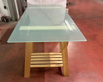 Scrivania Ikea con piano in vetro e due cavalletti in legno di betulla regolabili in altezza. Dimensioni del piano: 150cm. x 80 cm. cavalletti: 58x70/93 cm.