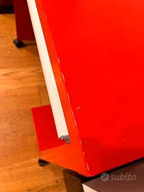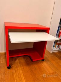 Scrivania Ikea rossa e bianca con ripiano 77 cm di larghezza x 50 cm di profondità x 75,5 cm di altezza. con ruote e ripiano estraibile. Usato con segni del tempo/usura. No spedizione