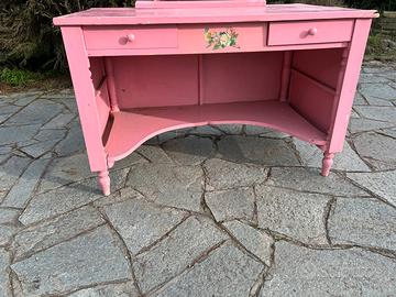Vendo scrivania vintage di colore Rosa con due cassetti e specchio. La scrivania è in legno ed essendo un mobile vintage presenta qualche segno di usura. Vendo per inutilizzo Trasporto a carico dell’acquirente No trattabile