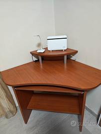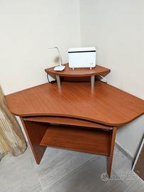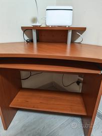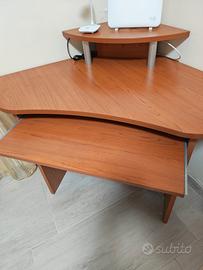 Scrivania in legno angolare in legno ciliegio, con supporto estraibile per tastiera e supporto per modem, casse e altro. Dimensioni: 85 cm per 85 cm i lati muro angolari, diagonale da spigolo a spigolo 125 cm, cassetto tastiera 70 cm larghezza, 30 cm profondità, altezza 73,5 cm. In ottime condizioni.