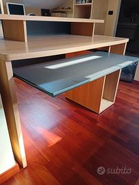 Scrivania in laminato effetto legno chiaro con alzatina. Dotata si vano a giorno porta PC e porta tastiera estraibile di colore grigio. Presenta solo qualche lieve sbeccatuta sulla bordatura anteriore Dim 120x75xh73
