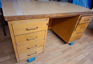 Scrivania in legno, anni '70. Usata ma ancora utilizzabile. Il ripiano si presenta con alcuni segni dati dall'usura del tempo. I cassetti sono otto, quattro per lato. Colore nocciola, le maniglie dei cassetti sono in metallo color oro. Le basi d'appoggio a pavimento sono per tutta la larghezza in metallo. La parte centrale è aperta e misura cm 56 con un'altezza cm 71. Le dimensioni; lunghezza cm 145, larghezza cm 75 , altezza cm 78. la larghezza esterna dei cassetti è di cm 35 , quella interna cm 31x 52. Vendo a 22,00 euro. ( solo ritiro a mano a Legnano).