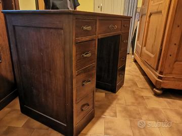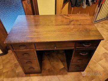 Bellissima scrivania in legno massiccio degli anni 60. In ottime condizioni necessita di piccoli lavori di ripristino per riportarla come nuova. Ha 4 + 4 cassetti laterali ed uno centrale. Misura 106 cm x 58 di profondità e 80 di altezza.