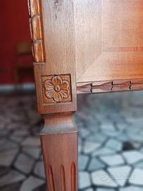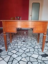 Scrivania anni 60 in legno dal design accattivante con intarsi e modanature che corrono lungo i bordi.