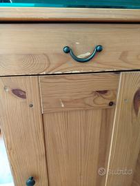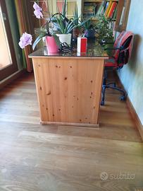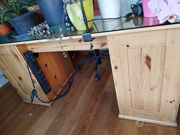 Vendo ampio scrittoio in legno con 5 cassetti molto profondi, ed uno sportello con ripiani, molto comodo per mettere tutti i tuoi documenti, fatture, bollette, ecc. Inoltre i cassetti hanno le guide in metallo, comodissime per aprire e chiudere senza intoppi. E ha un vetro sopra il ripiano che protegge il legno e permette di scrivere o disegnare senza problemi tutte le tue creazioni. In regalo offro una comoda sedia con rotelle perfetta per lavorare alla scrivania. Ha piccole ammaccature molto discrete che non intaccano la bellezza del legno e la visione generale del mobile. Per le misure o altre informazioni contattatemi in privato. Non si fa spedizione.
