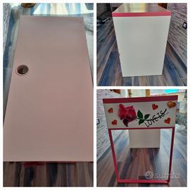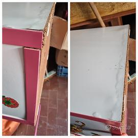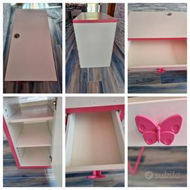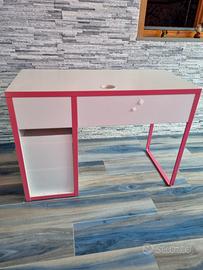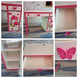 Scrivania bianca e rosa. Scrivania con cassetti e anta con mensole. Decorata con adesivi. I pomelli sono a forma di farfalla. I cassetti hanno i fermacassetti per evitare estrazioni complete. Le mensole sono regolabili e estraibili. L'anta è utilizzabile anche come scompartimento per il case del pc. Foro passacavi. Piedistallo in metallo rosa. Usata ma sempre in buone condizioni. Segnalo soltanto due piccole ammaccature sul ripiano e sul lato, facilmente risolvibili con una punta di vernice bianca e un rigonfiamento del legno nella parte bassa dello sportello, risolvibile con una fascia decorativa adesiva per coprire. Tutto visibile in foto. Misure cm 105x50 alta cm 75. Non spedisco. Ritiro in luogo. Zona Follonica (GR)