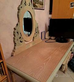 Vendo scrivania in legno rosa e verde pastello intagliata. La scrivania è completa di specchio cassetto e sedia. Non ha difetti e la vendo per inutilizzo.