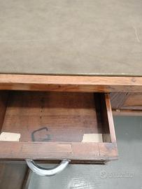 Scrivania in legno del XIX secolo, caratterizzato da piano di lavoro con inserto in pelle e/o simil, due cassetti laterali da 30 cm circa e quello centrale con chiave da cm 55 circa.