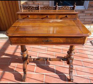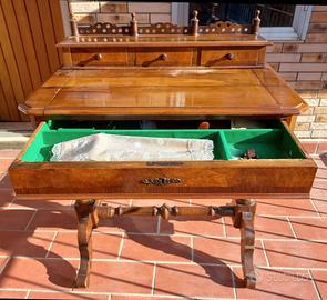 Presenta un cassetto principale e sotto il piano di lavoro c'è una "SECRETAIRE" cioè un cassetto nascosto per riporci documenti o piccoli oggetti,e un'alzatina superiore con tre cassettini più piccoli.