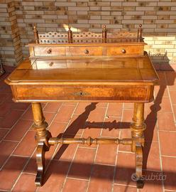 Scrivania/scrittoio, risalente al XIX secolo (periodo Luigi Filippo o Umbertino), realizzata in legno di noce e radica di noce. Lo stile è coerente con il periodo Luigi Filippo o Umbertino, diffuso nella seconda metà del XIX secolo. Le gambe tornite a rocchetto sono un elemento distintivo di questo design.