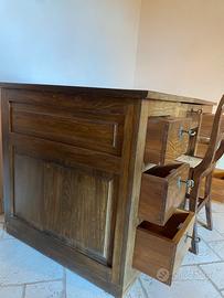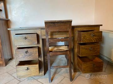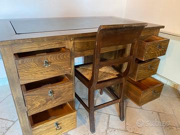 6 ampi cassetti funzionanti, con chiave e serratura vintage. Scrivania realizzata in legno massello, probabilmente rovere o frassino. Sedia inclusa nel prezzo. Per ovvie ragioni non spedibile. ANTIQUE WOODEN CONSOLE WITH DRAWERS