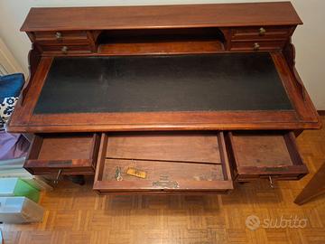 Vendo Scrivania in Legno Massello dei primi del Novecento. Con Top in Pelle originale. Con N.5 Cassetti con chiave e N.4 cassetti nel vano superiore senza chiave. Dimensioni: Larghezza Totale: 1250mm (Larghezza: 1190mm Piano da Lavoro). Altezza Piano di Lavoro: 820mm. Altezza Totale: 970mm. Profondità Totale: 610mm. Profondità Piano di Lavoro: 430mm. Altezza Gambe: 550mm. diametro Gambe Tornite: 80mm. Altezza Centrale (sotto, vano sedia); 650mm. La scrivania si trova al Piano Primo. 250 euro non trattabili, con ritiro a Mano zona Treviso Selvana nel weekend. Non spedisco.