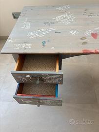 Vendo scrivania in legno massiccio, decorata a mano con scritte, simboli e disegni. Oggetto unico, con superficie vissuta e segni del tempo visibili. La struttura è solida e stabile.