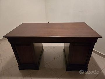 Vendo elegante scrivania in legno massello in ottime condizioni, completa di sedia coordinata con seduta e schienale imbottiti in tessuto rosso decorato.