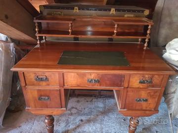 Scrivania d’epoca in legno massello. Dimensioni compatte. Design classico con gambe tornite, numerosi cassetti e alzata superiore originale. Piano ampio con inserto centrale.