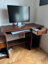 Scrivania in legno colore noce con piano ampio, cassetto laterale e vano inferiore portaoggetti, ideale per studio o smart working. Struttura solida e stabile, con design semplice e funzionale.