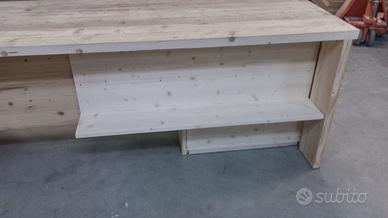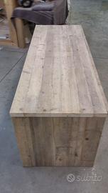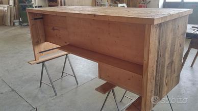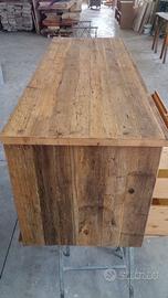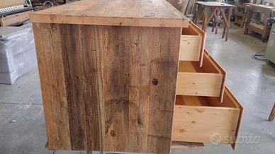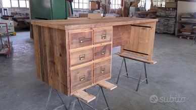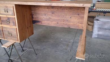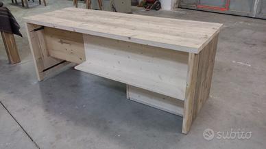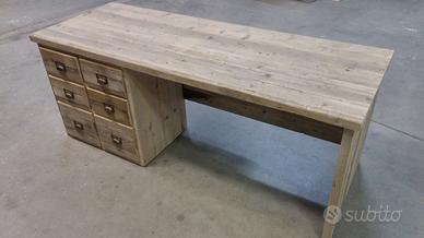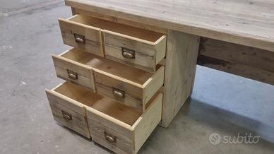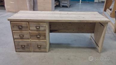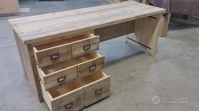 Scrivania costruita in legno vecchio 3 cassetti capienti che scorreranno su guide ammortizzate moderne con 6 frontali applicati con maniglie. con misure lungh 190 prof.70 h 75 tutto in legno vecchio recuperato da solai o parancole da muratore levigate leggermente in modo che siano morbide al tatto mantenendo la pattina originale naturale che il tempo ha fatto. come richiesto dal cliente sono state aggiunte nella parte posteriore un ripiano per posizionamento della wi/fi e sono state applicate barre in ferro a T in modo da rinforzare il legno che non si incurvi nel tempo. scrivania costruita su commissione e venduta non teniamo magazzino ma dato che siamo i diretti produttori e avendo un laboratorio artigianale costruiamo mobili e quant'altro su specifiche ed esigenze del cliente, nel prezzo completo di finitura naturale trasparente franco fabbrica iva non comprendente nel prezzo. essendo i diretti produttori costruiamo su misura e da disegno dal cliente. ASTENERSI RIVENDITORI E COMMERCIANTI