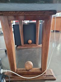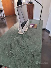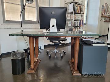 Scrivania vintage con base antica in legno e piano in marmo verde delle Alpi. Misure: 160x80x77 cm circa. La base in legno presenta alcuni segni di usura.