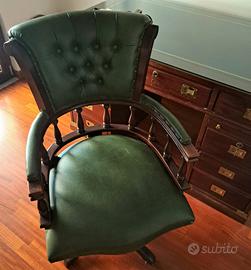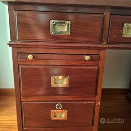 scrivania stile marina in mogano. Rivestimento superiore in pelle blu e protetta da vetro. 8 cassetti + uno centrale ribaltabile per alloggio tastiera computer. Due ripiani laterali a scomparsa. Buono stato. Nell'offerta è inclusa sedia sempre stile marina in ottimo stato. Seduta e schienale in pelle verde scuro. Ritiro a carico dell'acquirente.