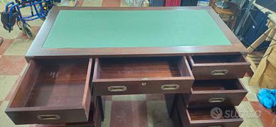 Scrivania stile marina (conosciuta anche come scrivania da campagna o "campaign desk"), caratterizzata da una struttura robusta in noce con dettagli funzionali in ottone dotata di 9 cassetti.