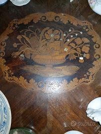 Scrivania sagomata in noce con cassetto epoca prima metà 1800 con intarsio in madreperla e legni pregiati sul piano