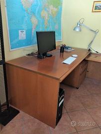 Scrivania ad angolo e cassettiera, eseguite in legno impiallacciato noce.
