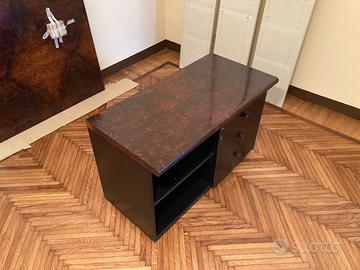 Scrivania di design con piano in legno massello e radica + cassettiera accessoria con piano sempre in legno e radica.