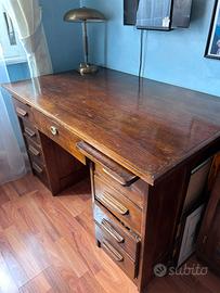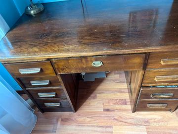 Bellissima scrivania in rovere, inizio 900. Con 8 cassetti laterali, e uno centrale grande. Misure: 130x 80x 78 cm.