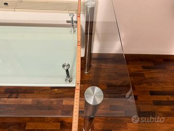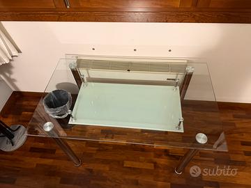 Vendo per inutilizzo scrivania in vetro Scrivania in vetro 120x70 cm con ripiano. In buone condizioni, i piedini sono stati sostituiti e verniciati e due gambe re-incollate con apposita colla acrilica. Il vetro ha qualche graffio, normale usura, si nota pochissimo. Ideale per smart working, visibile a Rovigo. Non spedisco, non la smonto e non la trasporto. É completamente smontabile, le gambe e i sostegni sono sorretti da cilindri di acciaio e barre filettate.