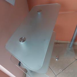 scrivania con vari ripiani situati altezze diverse e con grandezze diverse dalla più piccola alla più grande con un lato vetro lucido e l'altro lato è opaco