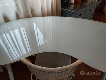 Scrivania in vetro bianco dal design particolare. Marca Ikea modello Galant. La forma a fagiolo la rende molto comoda. Le gambe si possono regolare in altezza e anche l'inclinazione dei piedini è regolabile. Completa di portacavi. In ottimo stato il piano d'appoggio, in buono stato il resto.