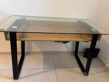 Scrivania con ripiano in vetro, buone condizioni, due piccoli difetti riportati in foto sulla parte in legno e un leggero graffio sul vetro non visibile in foto Misure 120x 59