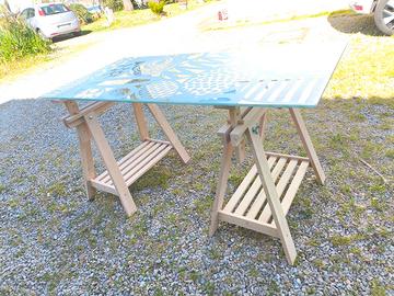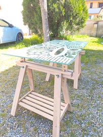 Vendo tavolo nuovo, mai usato, dal design unico e contemporaneo, perfetto per chi cerca un elemento d’arredo originale e di grande impatto visivo. Piano in vetro trasparente con decorazioni artistiche bianche a motivi geometrici e astratti, che donano un tocco di eleganza e creatività a qualsiasi ambiente. Struttura robusta in legno naturale, con gambe a cavalletto e pratici ripiani inferiori per riporre oggetti o decorazioni. Design versatile, ideale sia per interni moderni che per spazi esterni coperti, come terrazze o giardini. Dimensioni generose che lo rendono perfetto per pranzi, cene o come tavolo da lavoro creativo.