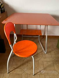 Scrivania in vetro temperato arancione con struttura metallica finitura alluminio e relativa sedia