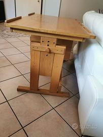 Scrivania in legno massiccio Artigianale. Regolabile in altezza e con piano inclinabile Cassettiera laterale spostabile sul lato desiderato. Qualche graffio dovuto all'usura sul piano e su un lato della cassettiera. Dimensioni 1100x700, spessore ripiano 25mm. altezza regolabile da terra: 68-80 cm.