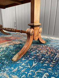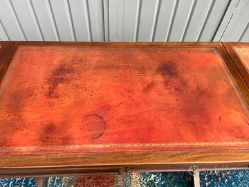 Bella scrivania epoca fine 1800, inglese, in legno di mogano massello e ripiano in pelle originale, con alette laterali. Elegante, pratica e particolare. Da centro stanza.